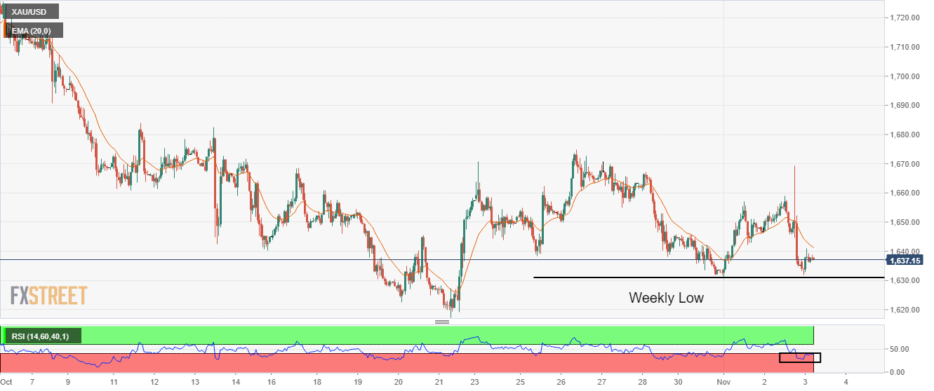 在一小时图上,金价徘徊于自周二低点1,630.77美元以来的周低点附近。该贵金属位于20EMA均缐下方,表明后市将扩大跌势。